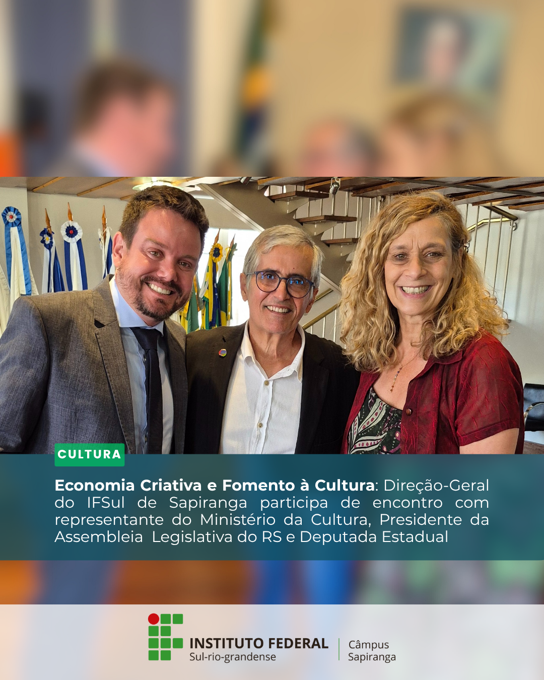 Além disso, em conversa com o representante do Ministério da Cultura, a Direção-Geral discutiu possibilidades de participação do câmpus em iniciativas e projetos apoiados por meio dos mecanismos de incentivo da Lei Rouanet, especialmente relacionados à economia criativa, produção cultural e extensão.