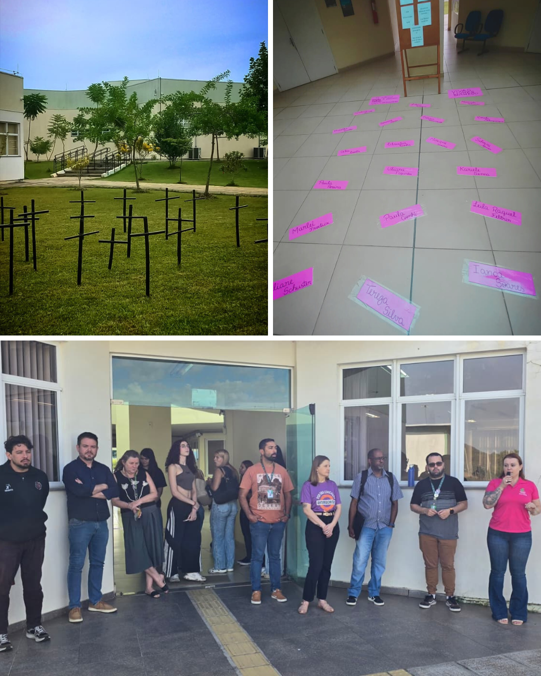 Além da exposição, nesta quarta-feira, dia 11, durante a manhã, o NUGEDS realizou uma intervenção simbólica no gramado do pátio do câmpus. Na ação, 20 cruzes foram afixadas no local, representando os 20 casos de feminicídio registrados no estado neste ano. O gesto buscou provocar reflexão na comunidade acadêmica e reafirmar o compromisso institucional com a defesa da vida e dos direitos das mulheres.