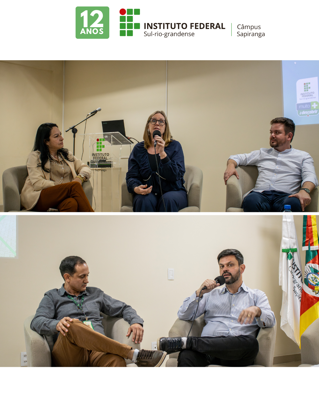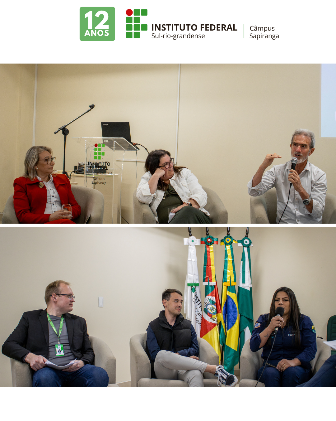 O evento do dia 8 de outubro contou com a presença da Prof.ª Lia Pachalski, vice-reitora do IFSul; Rita Della Giustina, ex-vereadora de Sapiranga; Elisabete Ceron, coordenadora do Polo da UAB de Sapiranga; Antônio Machado, radialista da Rádio Ferrabraz; Valter Lenine Fernandes, diretor-geral do Câmpus Sapiranga; Rita de Cássia Dias Costa, ex-diretora-geral; Marcos Rijo, chefe de Ensino, Pesquisa e Extensão; Eduardo Schmidt Fernandes dos Santos, chefe de Administração e Planejamento; Júlio Korzekwa, servidor que integrou a equipe de implantação do câmpus; além dos egressos Vilma Taís Muria Simões (curso técnico em Eletrotécnica/EJA) e Vitor Edinei Carvalho Gomes (curso técnico em Informática).