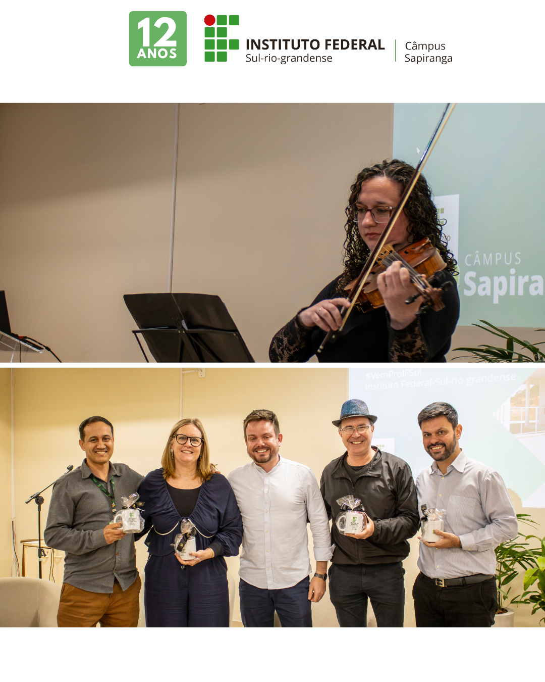 Entre os dias 6 e 10 de outubro, o câmpus realizou diversas atividades em alusão ao seu aniversário, celebrado oficialmente em 7 de outubro, data em que o IFSul Câmpus Sapiranga completou 12 anos de existência. As comemorações começaram na segunda-feira (6) com a IV Noite Cultural, organizada pela professora de Arte Angélica Neuscharank, com o apoio de servidoras, servidores e estudantes, realizada no Centro Municipal de Cultura Lucio Fleck. Na terça-feira (7), o câmpus celebrou o aniversário nos intervalos de aula dos três turnos, com direito a parabéns e torta compartilhada entre toda a comunidade escolar. Já na quarta-feira (8), além das rodas de conversa, houve um almoço organizado pelo professor Sérgio Migowski, reunindo servidoras, servidores e funcionárias/os terceirizadas/os. As comemorações se estenderam durante toda a semana, encerrando-se nos dias 9 e 10 de outubro, quando as redes sociais do câmpus foram movimentadas com 24 depoimentos de egressas/os, estudantes e servidoras/es, celebrando a trajetória e o impacto do IFSul Sapiranga ao longo desses 12 anos.