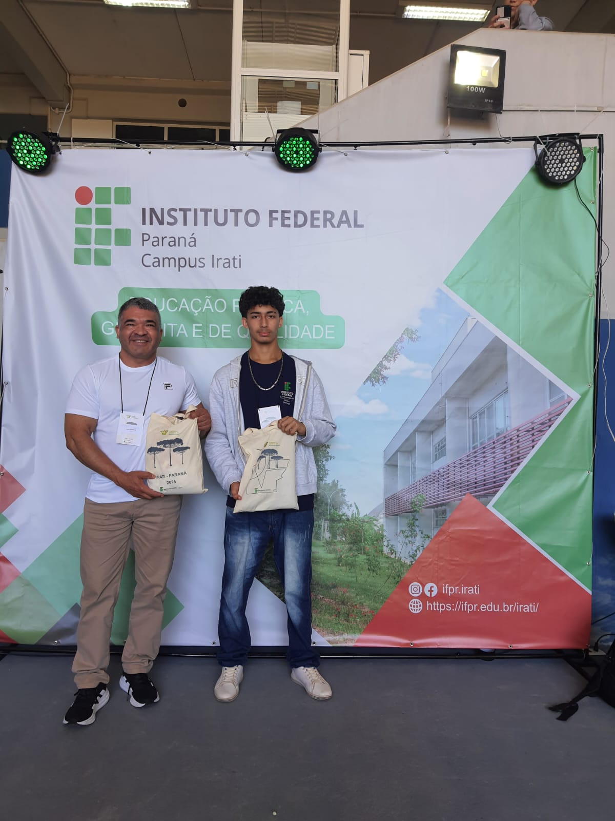 Moisés Rodrigues de Souza, da turma ETM1T, representou o câmpus em Irati (PR), acompanhado pelo professor Vasco, que também participou da programação oficial do evento.