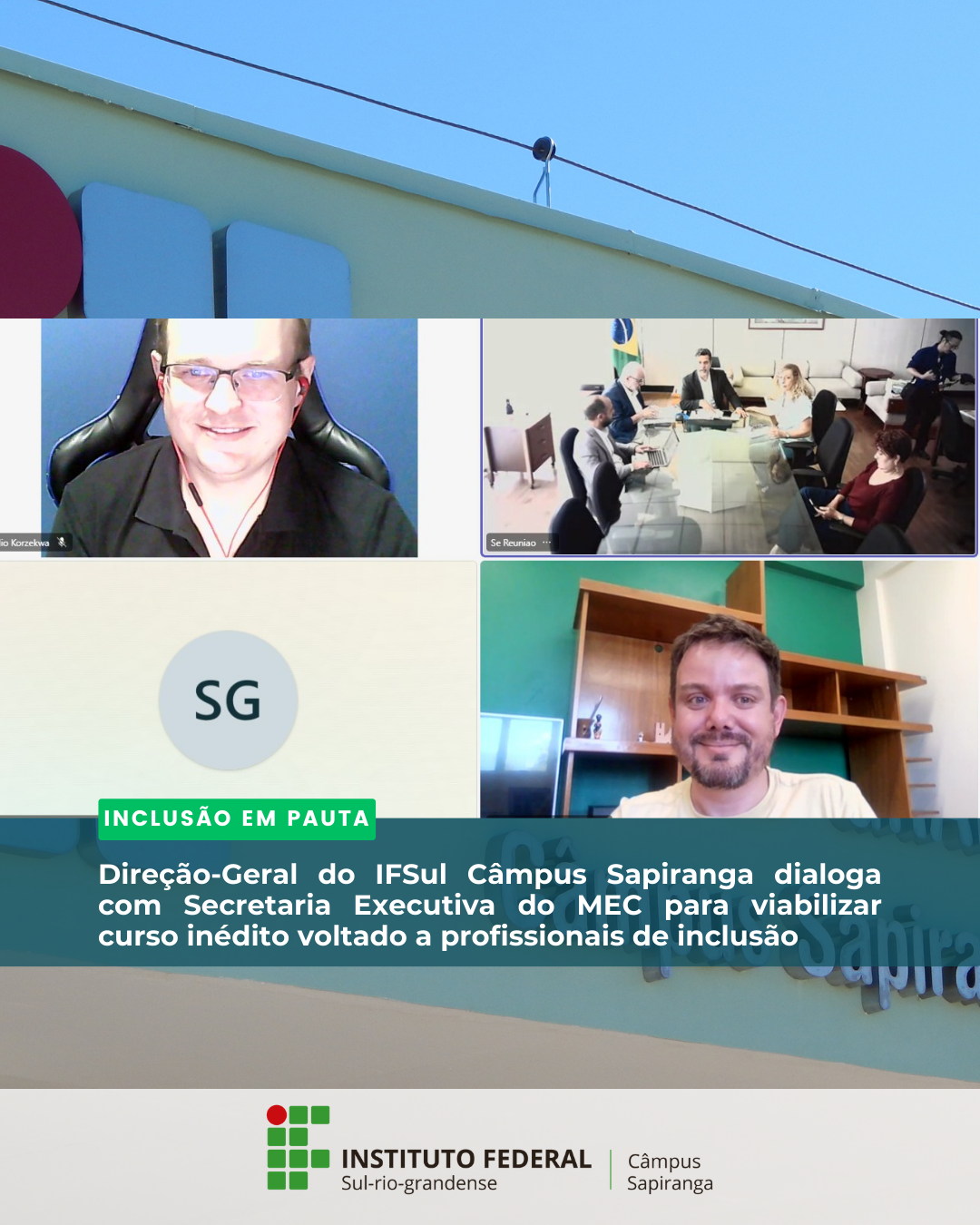 A Direção-Geral do Câmpus Sapiranga do Instituto Federal Sul-rio-grandense (IFSul) participou, nesta sexta-feira (5), de uma reunião híbrida com a Secretaria Executiva do Ministério da Educação (MEC) para tratar da inclusão de um curso técnico inédito no Catálogo Nacional de Cursos Técnicos (CNCT). A proposta foi desenvolvida no próprio câmpus pelo diretor-geral, professor Valter Lenine Fernandes, responsável também pela elaboração do Projeto Pedagógico do Curso Técnico Subsequente em Educação Inclusiva.